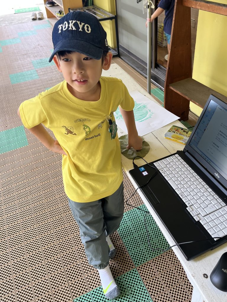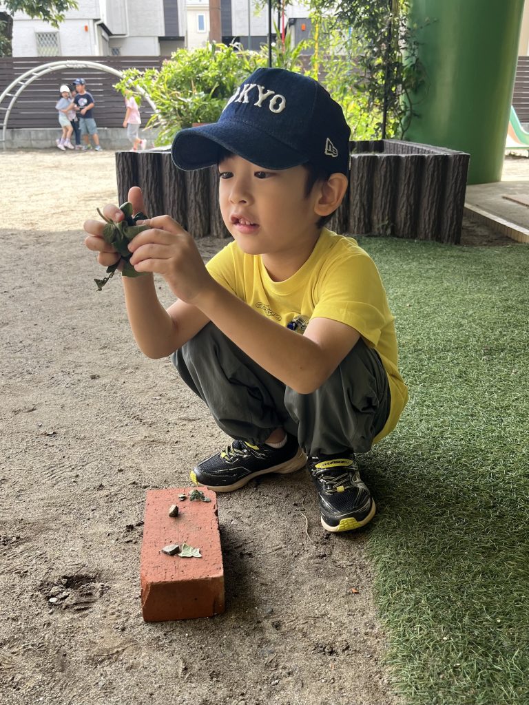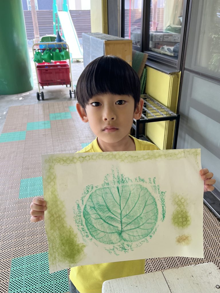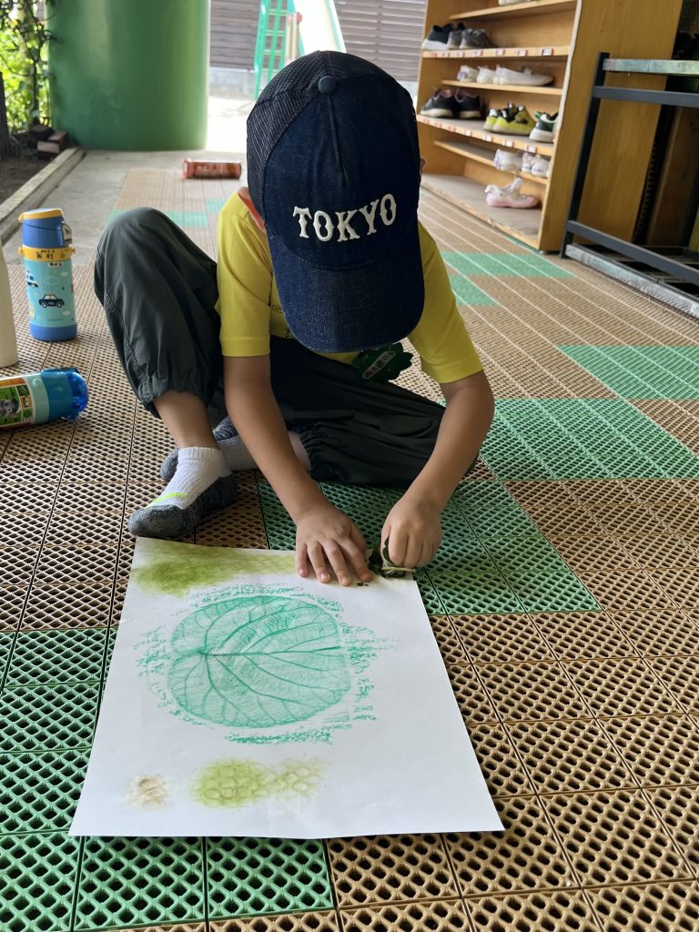 1学期、キウイの葉っぱを水につけておいたら、臭くてねばねばしてしまったことを思い出し、「あれ、どうやったらねばねばした水じゃなくて水につけておけるのかな」という疑問をもってPCでキウイの葉っぱを調べました。そして、葉を水に漬けておいても腐らない方法を知り、早速、葉を洗って、葉っぱをバケツに入れ水を入れました。明日お休みだけど、一日くらい水を取りかえなくても大丈夫かな?とおいて帰りました。そして、キウイの葉の葉脈をこすり絵にしたり、葉っぱをつぶして色を出したりと、葉っぱ研究が続きました。