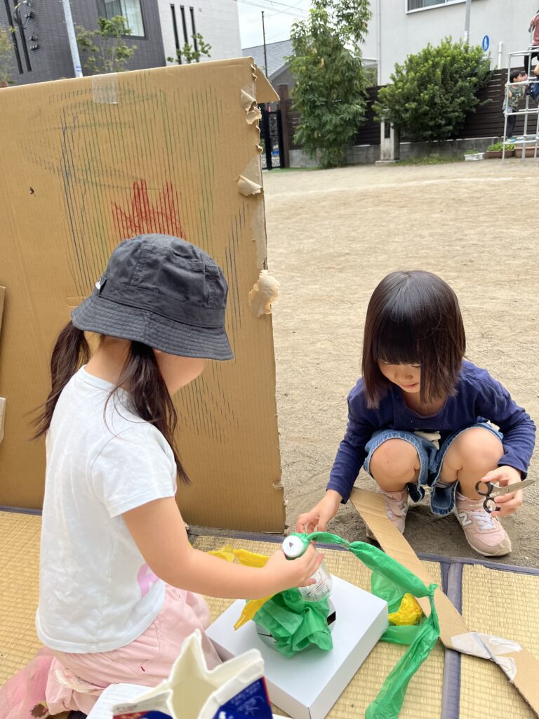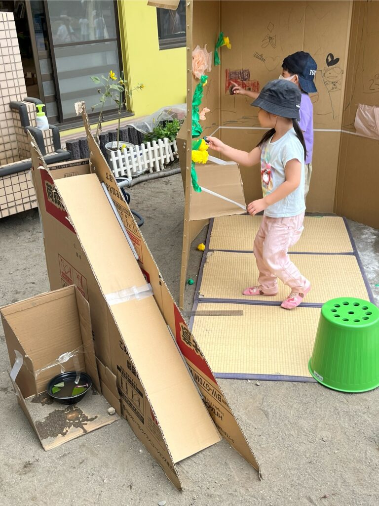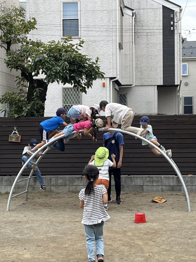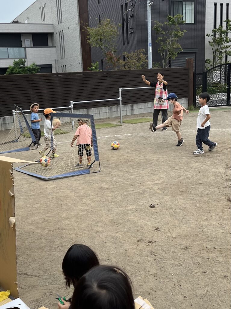 今日は戸外に出て遊ぶのにちょうど良い天気でした。異年齢で遊ぶ姿が見られました。サッカーに砂場に太鼓橋に家作り。どこでも楽しそうに会話する姿が見られ、友達の遊びに感化されて遊んだり、仲間に入れてもらうことの喜びを感じたりしていました。明日の運動会、お天気は雨模様ですが、小学校の体育館で思いきり楽しみましょう!