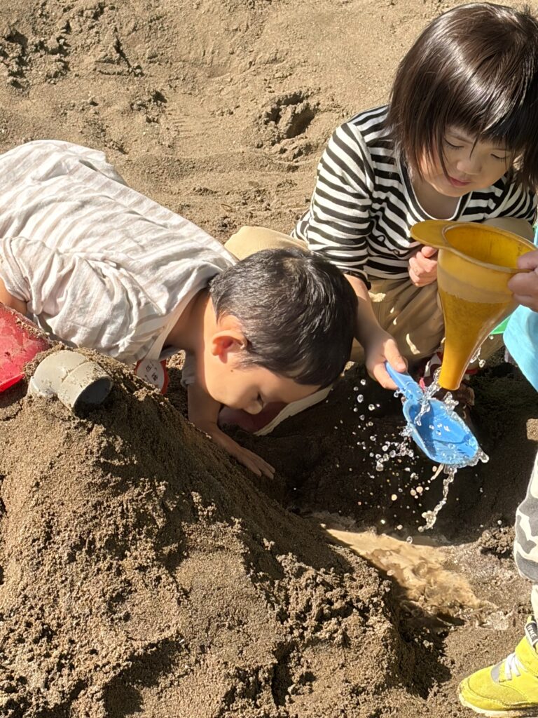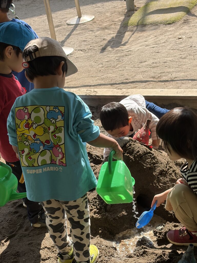 年少児が恐竜で盛り上がっています。砂場で恐竜の卵、恐竜のエサ、そして今日は恐竜のうんちを作りました。はじめはじょうごから出てくる泥水に水を足しながら「うんちだ、うんちだ」、「これはおしっこだ」と喜んでいましたが、「高い山を作りたい」と一人が言い出すと、「うんちの山を作ろう」と皆で自分たちよりも高い山を作る気満々で取り掛かりましたが、「トンネルを作りたい」と一人が言うと、「いいね」とトンネル作業に取り掛かり、水を流しました。遊びながら、どんどん遊びが変わっていき、それを皆で同じ目的で遊べるようになったことを感じました。簡単にはできないことも皆でやる、途中、へこみそうになったら、少し先生が手伝いながら、完成すると「すごーい」「やったー」の喜ぶ声も聞かれました。満足いくうんち山ができました。