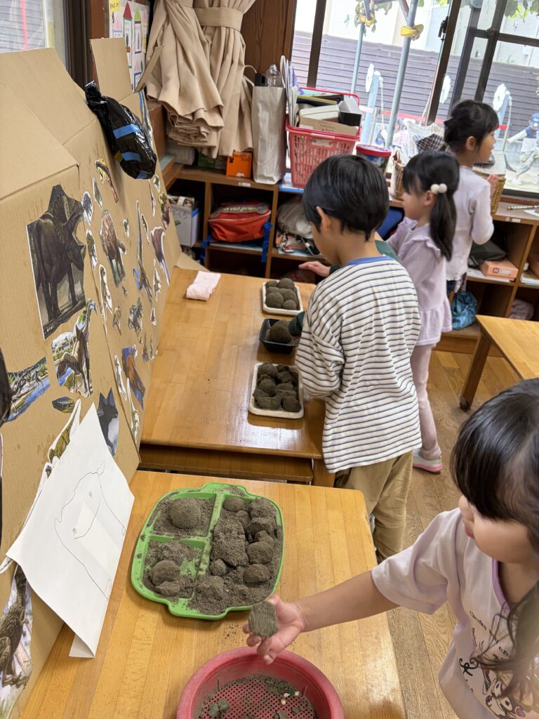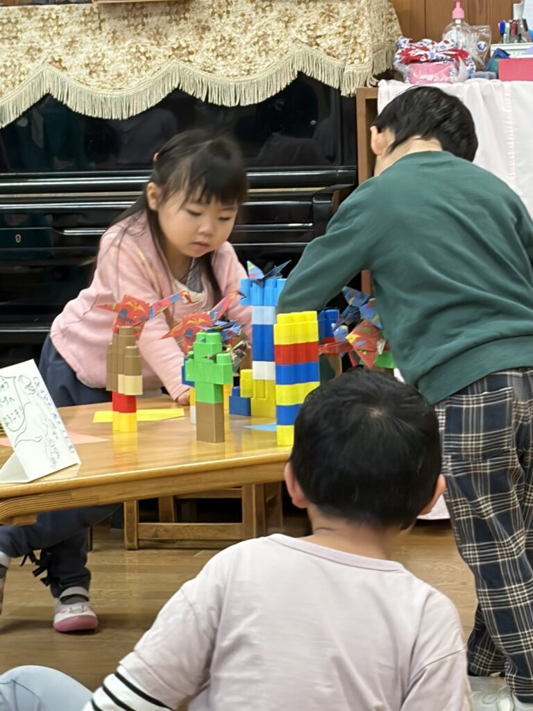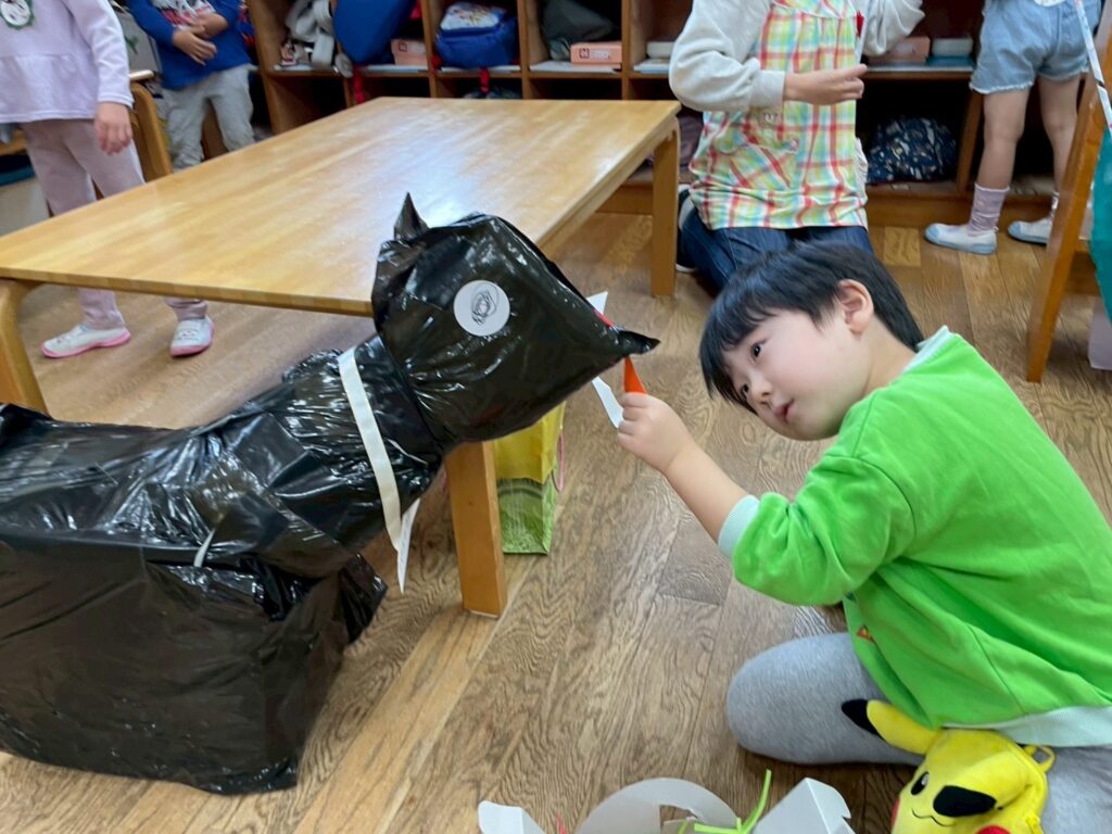 今日は第2回の茶道指導がありました。友達同士、お茶を点てあい、いただきました。次回は餅つきの日に保護者に振る舞います。心を込めてお茶を点てられたらいいですね。年少児の恐竜好きな子が段ボールに恐竜のイラストを選んで貼ったことがきっかけで、恐竜好きの子が集まり、「乗れる恐竜を作りたい」「恐竜のぬりえに棒つけたらいいんじゃない?」とペープサートにしたり、砂場では恐竜の卵、恐竜のエサ、恐竜のうんちと様々なものを作ったりしてきました。宇宙好きの子も加わり、今日、年中児、年長児を招待して恐竜宇宙展を開催しました。恐竜に乗ってもらえたり、卵の硬さに感動してもらえたり、ペープサートを楽しんでもらったり、先生が作成した折り紙恐竜を楽しんでもらったり、思った以上に喜んでもらえたことが嬉しかったようです。