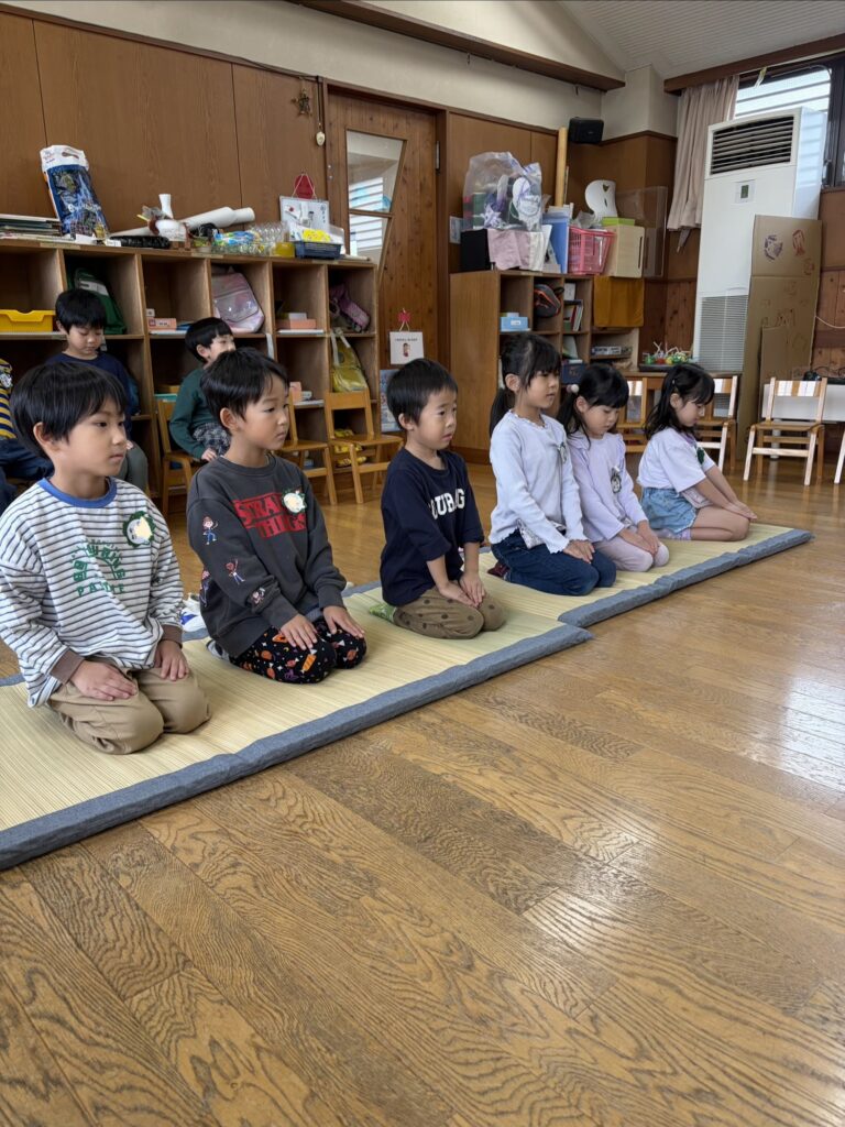 今日は茶道サークルと絵本サークルがあり、茶道サークルの後に、年長児の茶道指導も観ていただきました。絵本サークルは、帰り前に有志のお母さまに絵本を読み聞かせていただきました。