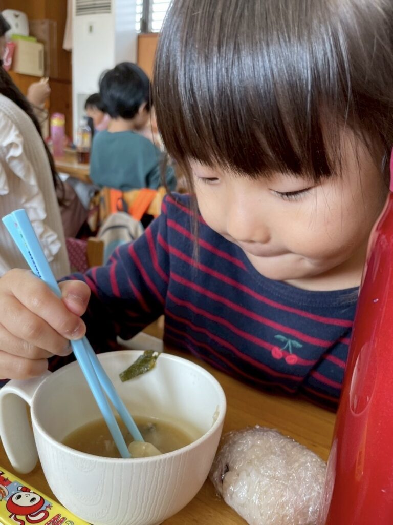 今日の昼食は、昨日収穫感謝礼拝で持ち寄った食材を使った感謝鍋(豚汁)をいただきました。今年は年長さんのお母様が有志で感謝鍋を作ってくださいました。具だくさんの豚汁をたくさんおかわりした子ども、苦手だったのに食べられるようになった子ども、苦手な物に少しだけチャレンジしてみる子どもと、様々な姿が見られました。感謝の気持ちを忘れずに、豊かな恵みを受け、これからも大きく育って欲しいと思います。