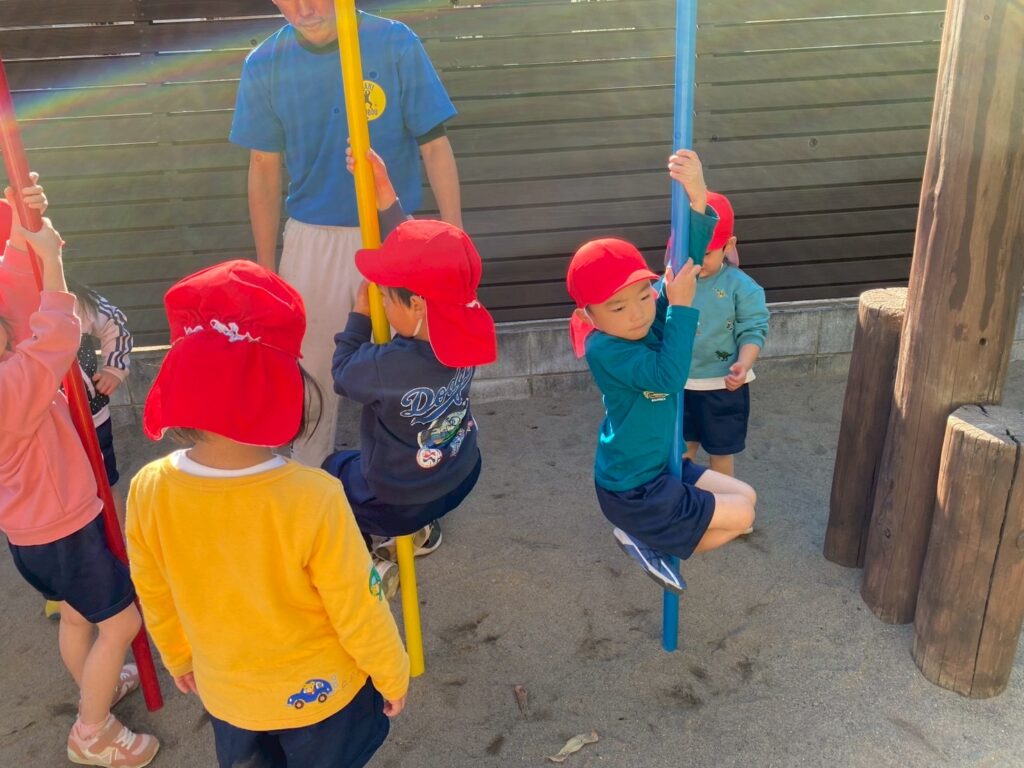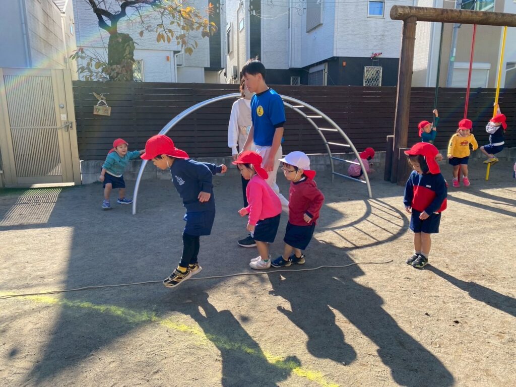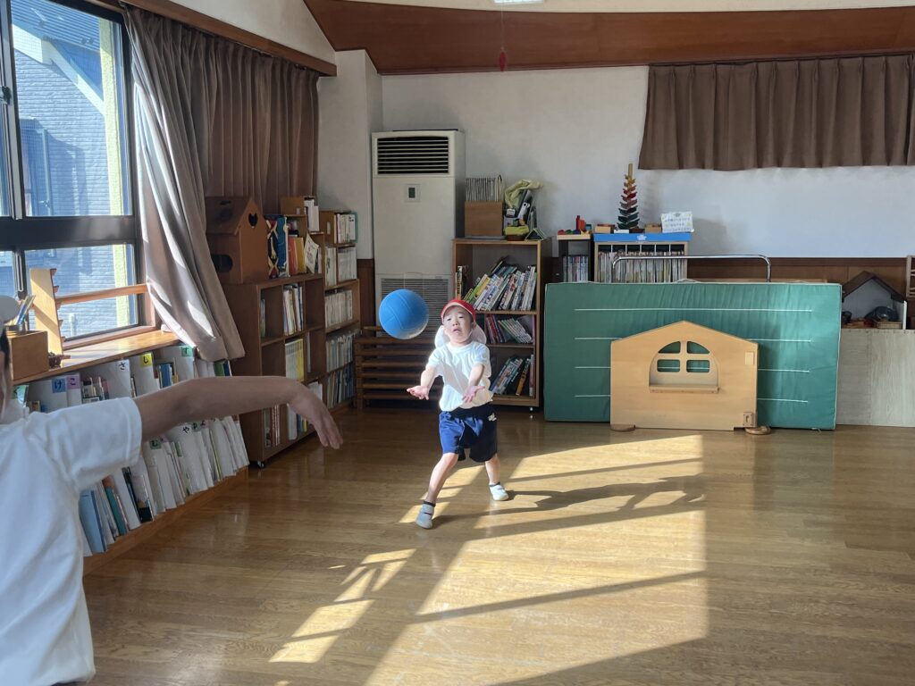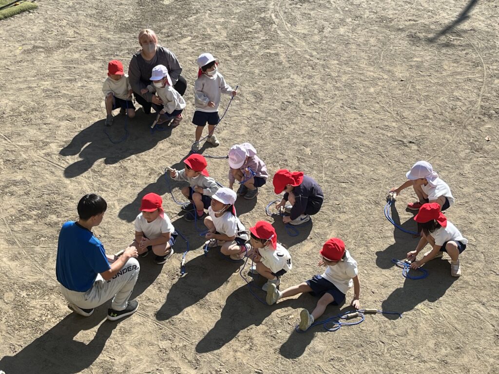 今日は体操指導がありました。年長児は、たくさん走る遊戯をしてから、ショルダースローでのキャッチボールをしました。投げるときのポイント、キャッチするときのポイントをそれぞれ教えてもらいました。ドッジボールを想定し、味方にパスをするときは、ふわっとした山なりの球を投げた方がいいこと、相手に当てるときは、直線的な速い球がいいことも知りました。その後、器具にも挑戦。年中・年少児は暖かい戸外で体を動かしました。年中児は、短縄と中当てをしました。短縄では、前跳びだけでなく色々な跳び方を教わりました。すぐにできなくても楽しく諦めずに挑戦していきたいですね。中当ても逃げるコツを教わり、少しずつ逃げ切れるようになってきました。年少児は遊戯やマラソンをして体を温めてから、登り棒と鉄棒にチャレンジしました。腕の力だけでなく足の力やおなかの力を使ってしがみついたりぶら下がったり。最後はおなかがペコペコになったみたいです。