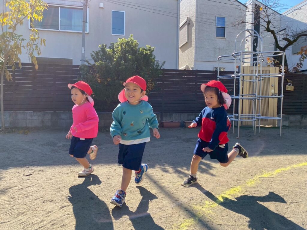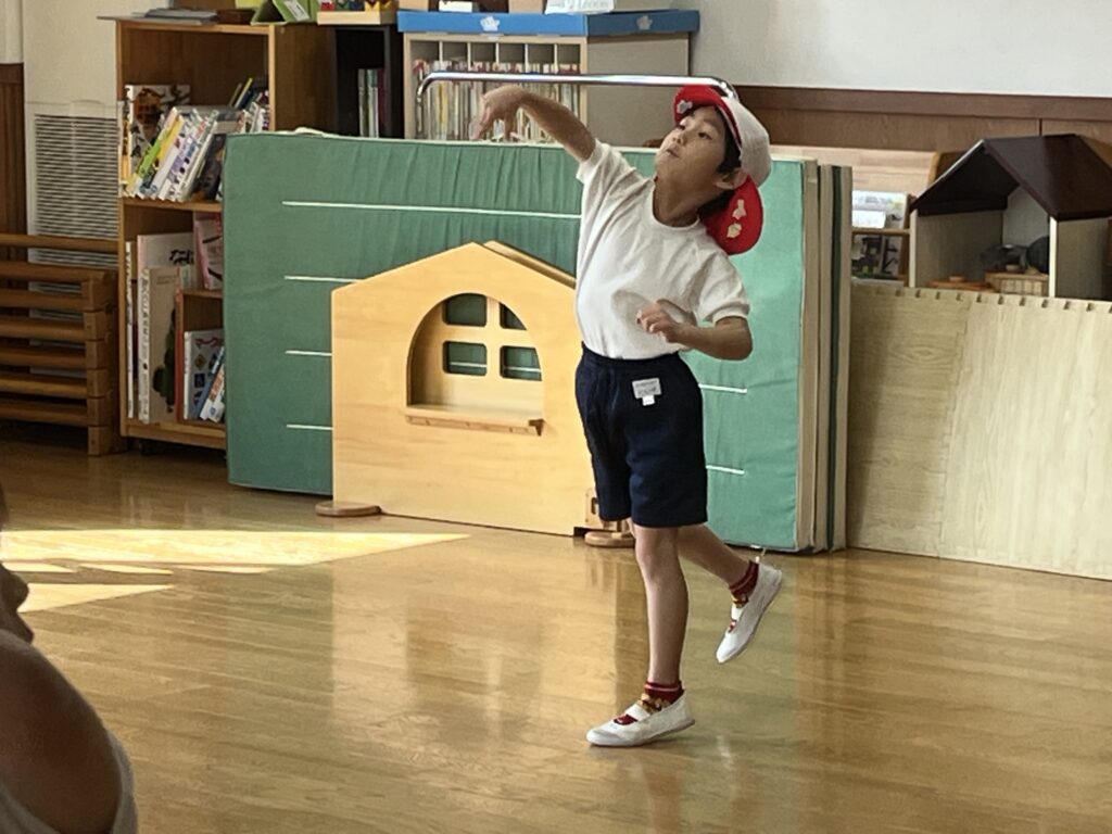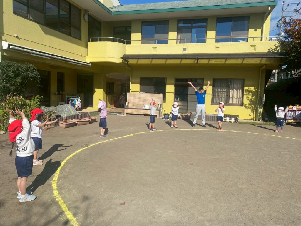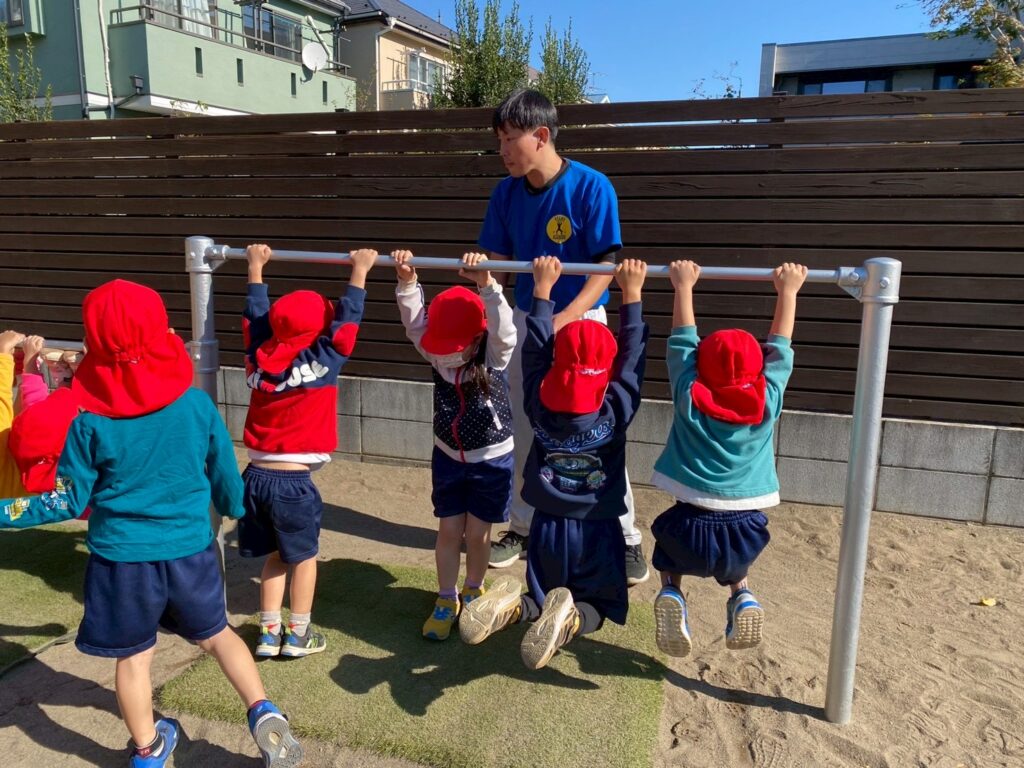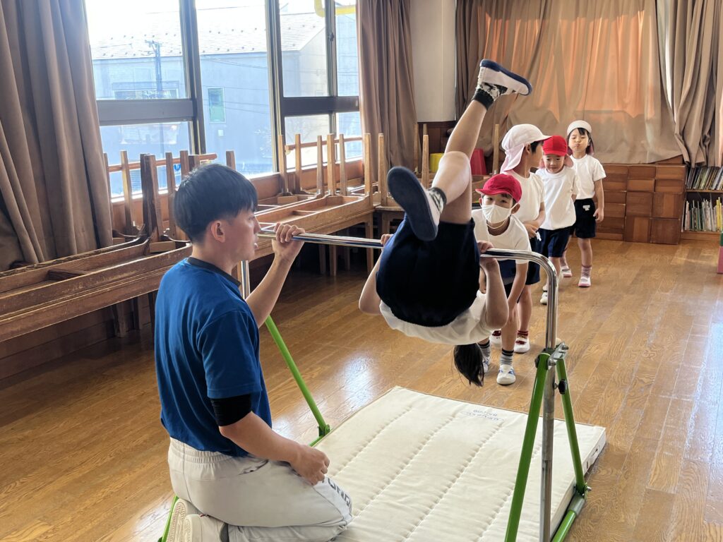 今日は体操指導がありました。年長児は、たくさん走る遊戯をしてから、ショルダースローでのキャッチボールをしました。投げるときのポイント、キャッチするときのポイントをそれぞれ教えてもらいました。ドッジボールを想定し、味方にパスをするときは、ふわっとした山なりの球を投げた方がいいこと、相手に当てるときは、直線的な速い球がいいことも知りました。その後、器具にも挑戦。年中・年少児は暖かい戸外で体を動かしました。年中児は、短縄と中当てをしました。短縄では、前跳びだけでなく色々な跳び方を教わりました。すぐにできなくても楽しく諦めずに挑戦していきたいですね。中当ても逃げるコツを教わり、少しずつ逃げ切れるようになってきました。年少児は遊戯やマラソンをして体を温めてから、登り棒と鉄棒にチャレンジしました。腕の力だけでなく足の力やおなかの力を使ってしがみついたりぶら下がったり。最後はおなかがペコペコになったみたいです。