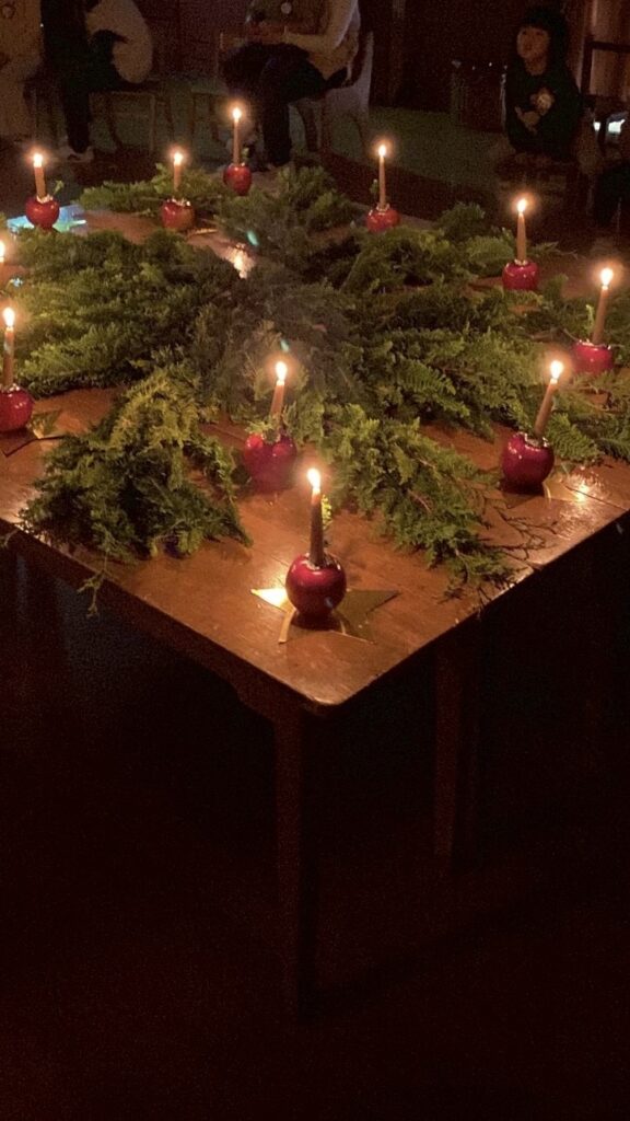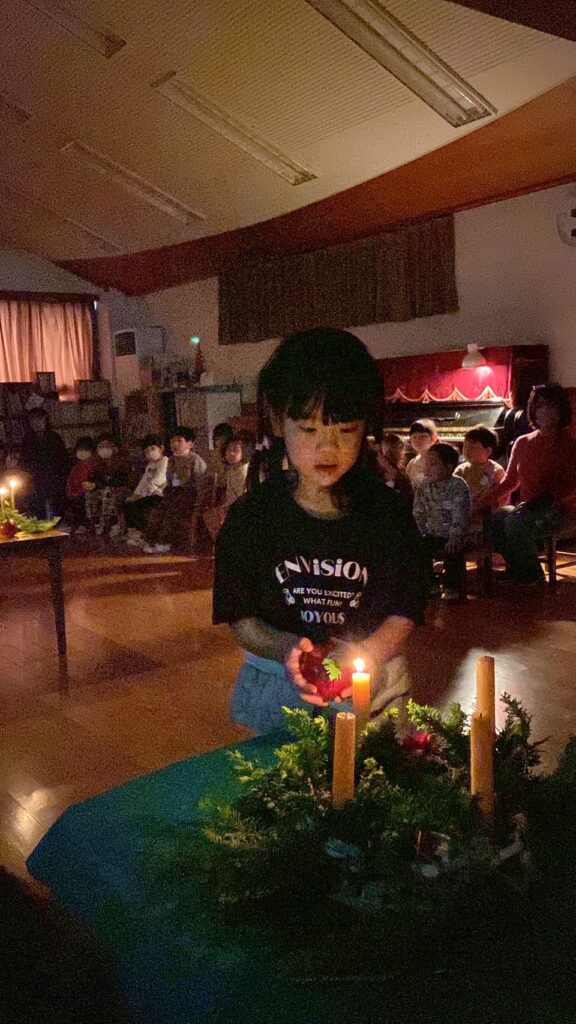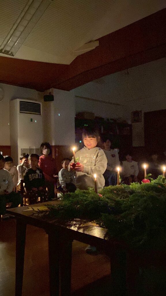 今日は朝から曇り空でした。ヒムロスギが園に運ばれ、ホールは、針葉樹の香りが漂いました。年長児は登園してすぐにリンゴをタオルで磨き上げ、リンゴの芯を取り除き、自分が作った蜜蝋ろうそくと短めのヒムロスギをアルミで巻いて、挿しました。そしてアドベントクランツに灯された1本のろうそくの火から、子どもたちはりんごろうそくに火をいただき、机に置いていきました。光が一つ、また一つと増えて、輝きを増していくたびに、神聖なるものの訪れを感じるようでした。どのろうそくもまっすぐに立ち、輝いていました。いつもと違う空間に子どもたちの表情もまた輝いて見えました。「光の子として歩みなさい」暗唱聖句がすっとおりてきました。