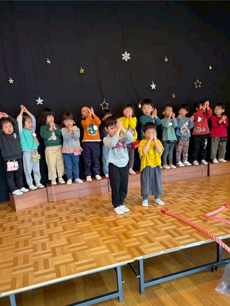 今日は、来週のクリスマス会のために有志のお母さま方が幕を付けてくださいました。ありがとうございました。ホールで、練習する子どもたちも幕がついて気持ちが高揚していました。きれいな星に思わず手が…星に手が届くのもうれしいですね。