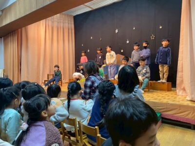 今日は、英語遊び の日。クリスマス会前にエレナ先生と一緒に「We wish you a Merry christmas」を歌いました。年少児もエレナ先生が大好き!外にエレナ先生が出てくると「遊ぼう」と誘いに来る子どもたち。