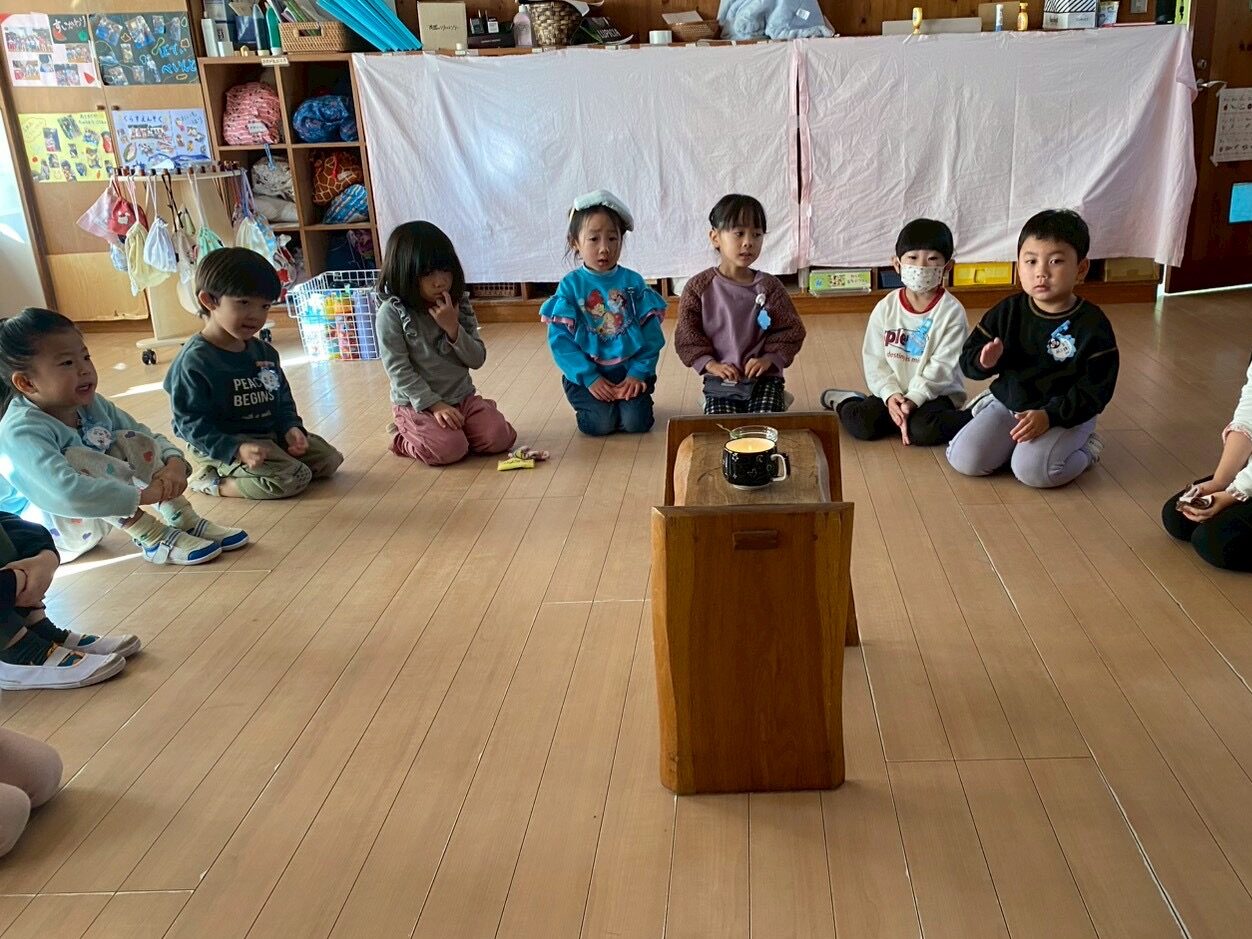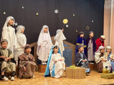 収穫感謝礼拝が終わって、いよいよクリスマスに向けての準備が本格的になり、イエス様のお誕生日のお祝いに素敵な歌や合奏、劇をプレゼントしようという気持ちで日々過ごしてきました。毎年、この時期になると美しいメロディが聴かれ、かわいらしい歌声、にぎやかな子どもの姿が見られます。次第にクラスの子どもの心が一つになっていき、静かな気持ちで本番を迎えます。子どもの心の中に、イエス様の温かな光が灯っていくようです。明日は、全員揃って、クリスマス会に臨めると嬉しいです。