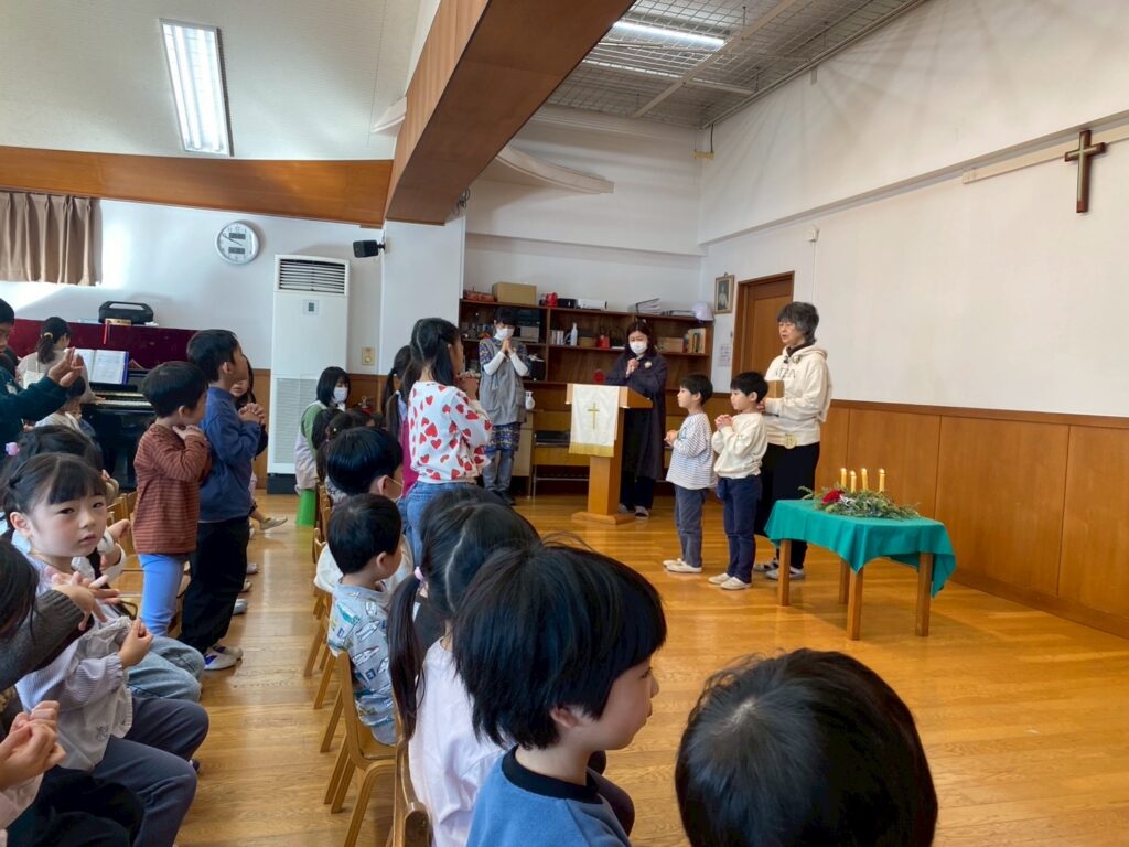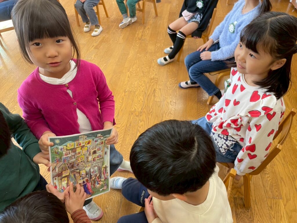2学期終業式を終えました。冬休みの過ごし方とお節料理の絵本を読みました。早寝、早起き、三食食べること、手洗いうがいをすること、知っている人には挨拶をすること、保護者の手を離さないで歩くことなどを伝えました。また、お節料理に興味を持つ子もいました。1月8日に元気に会えることを楽しみにしています。クリスマスまでもう少しありますが、今日はアドベントカレンダーを25日まで開けました。アドベントカレンダーを毎日開けるのもこの時期ならではの楽しみでしたね。