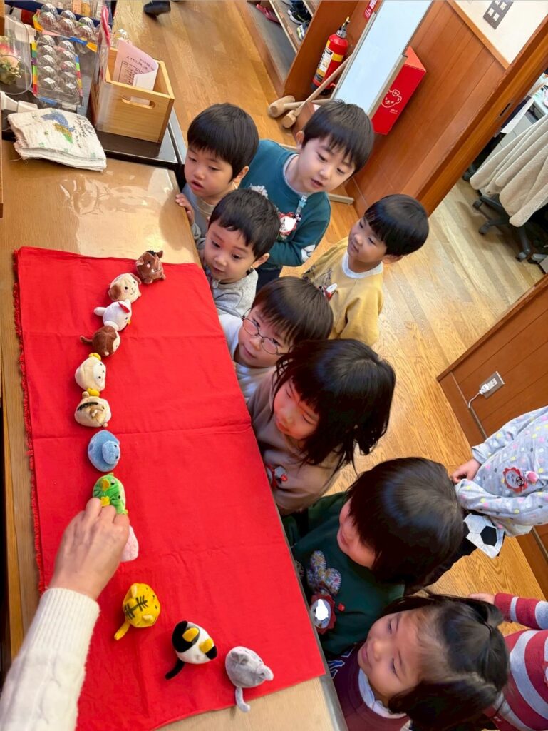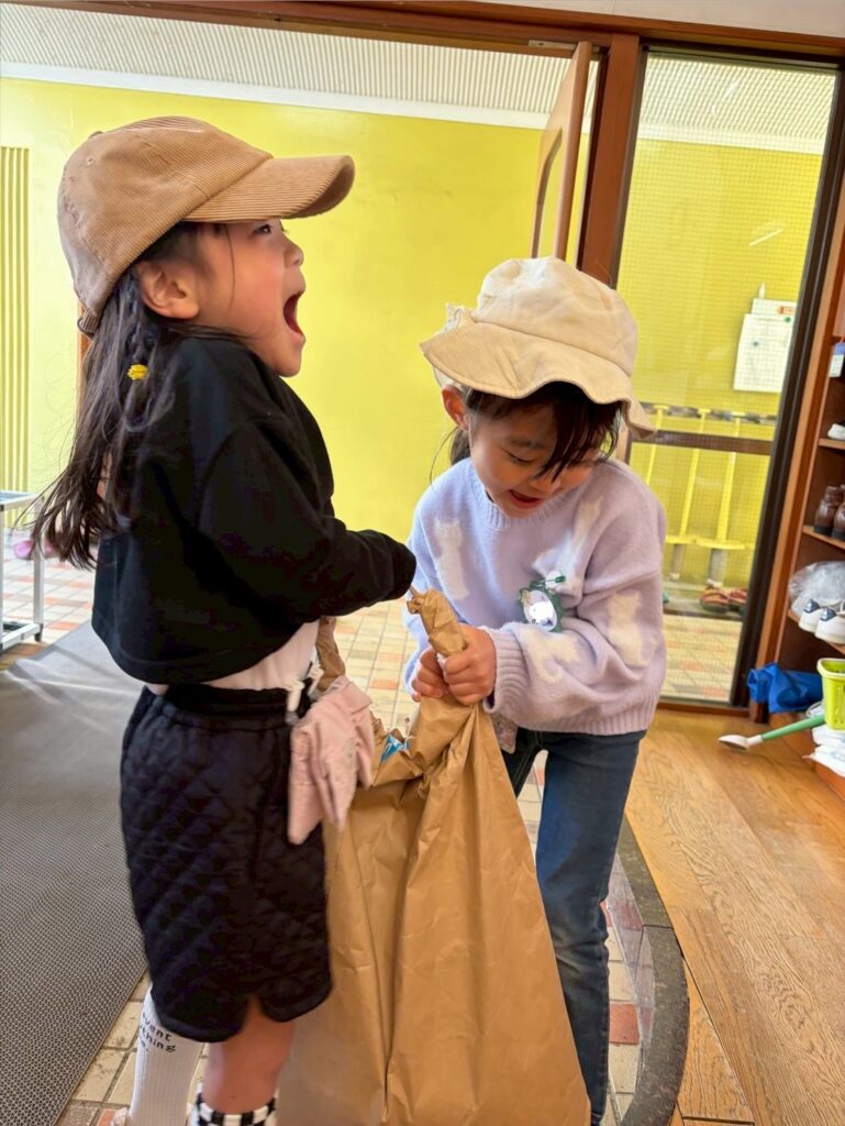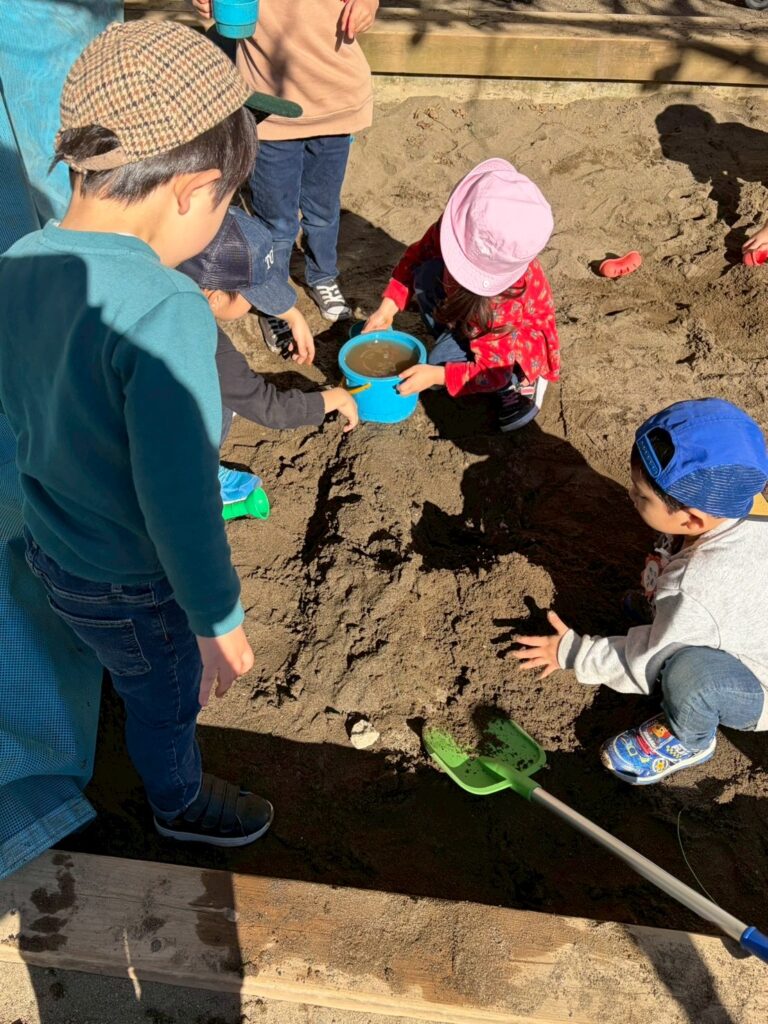 チェストの上に飾ってあった十二支のお手玉をじっくり見ている年少さん。午年になりましたね。お部屋で折り紙を楽しんでいる年中児。「ハート、できたよ。見てみて」土曜日に実施される餅つきのもち米がお米屋さんから届き、そのもち米を持とうとしている年長児。「おもたいね」砂場では異年齢で、山にトンネル、川作り。水の流れで砂が侵食するたびに年長児が上に上にと泥を救い上げる姿がありました。園生活を生き生きと楽しんでいます。