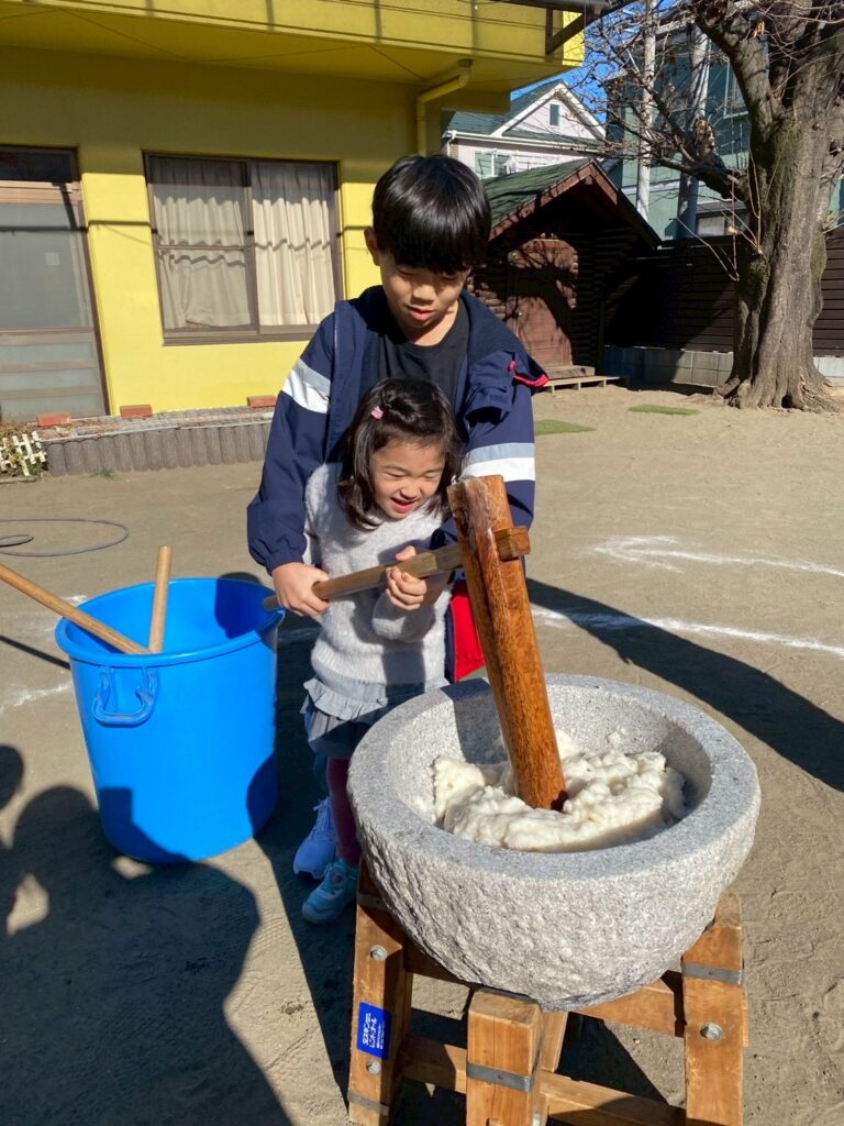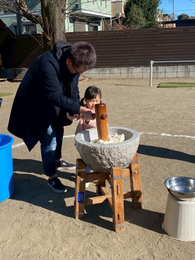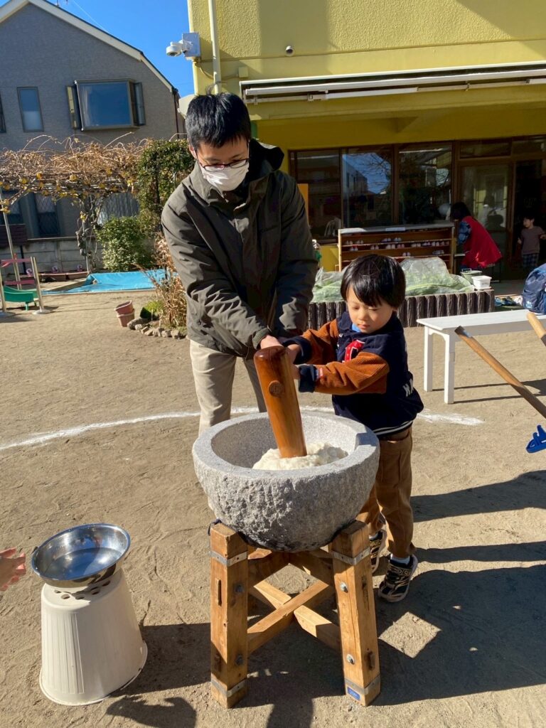 今日は餅つきでした。親子での餅つきは、楽しそうでした。「お餅つきが初めて!」「お餅食べたことがなかったけれど、おいしかった!」という子もいました。新春行事。今まではついたお餅は残念ながら食品衛生上、食べられなかったので処分していましたが、今年は鏡餅にしました。鏡餅は家で飾って知っている子が多かったのですが、のし餅を知らない子どもが多かったです。