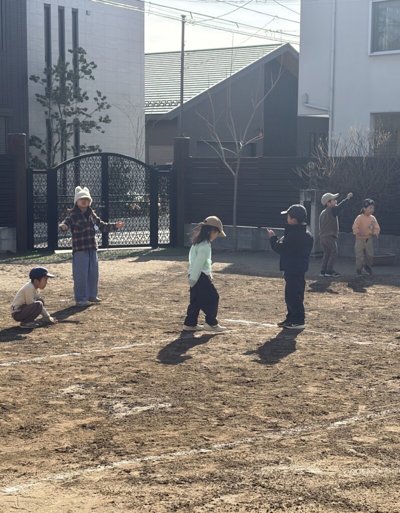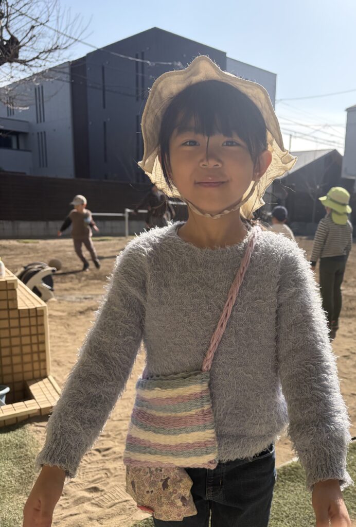 年少児がいない中での交流デイは10人くらいでしたが、遊ぶと、それぞれの縦割りグループで楽しむことができました。戸外で中当てを楽しんだり、室内ではないちもんめやリレーを楽しんだりしていました。年長児は毛糸のポシェットの完成者が続々と出てきています。