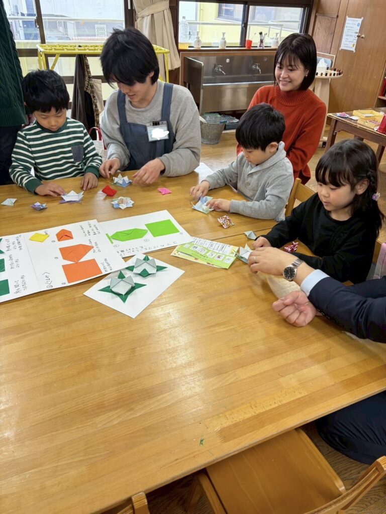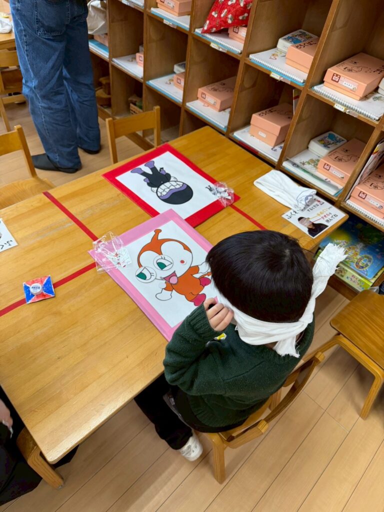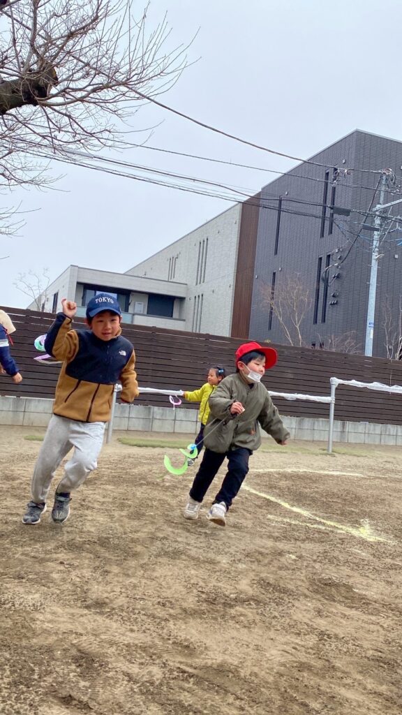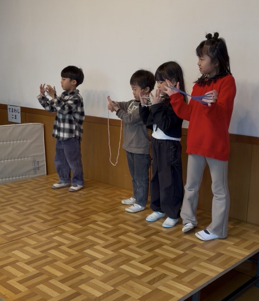 今日は伝承遊びの日。家族で伝承遊びを楽しんでいただきました。折り紙ごま作り、福笑い、たこ作り、かるた遊び、竹馬、ホッピング、たこあげ、けん玉、コマ回し、だるま落としなど色々と頑張りました。そして最後に発表をしたい子が発表しました。寒い中、お越しくださりありがとうございます。親子ならではの素敵な光景がたくさん見られました。