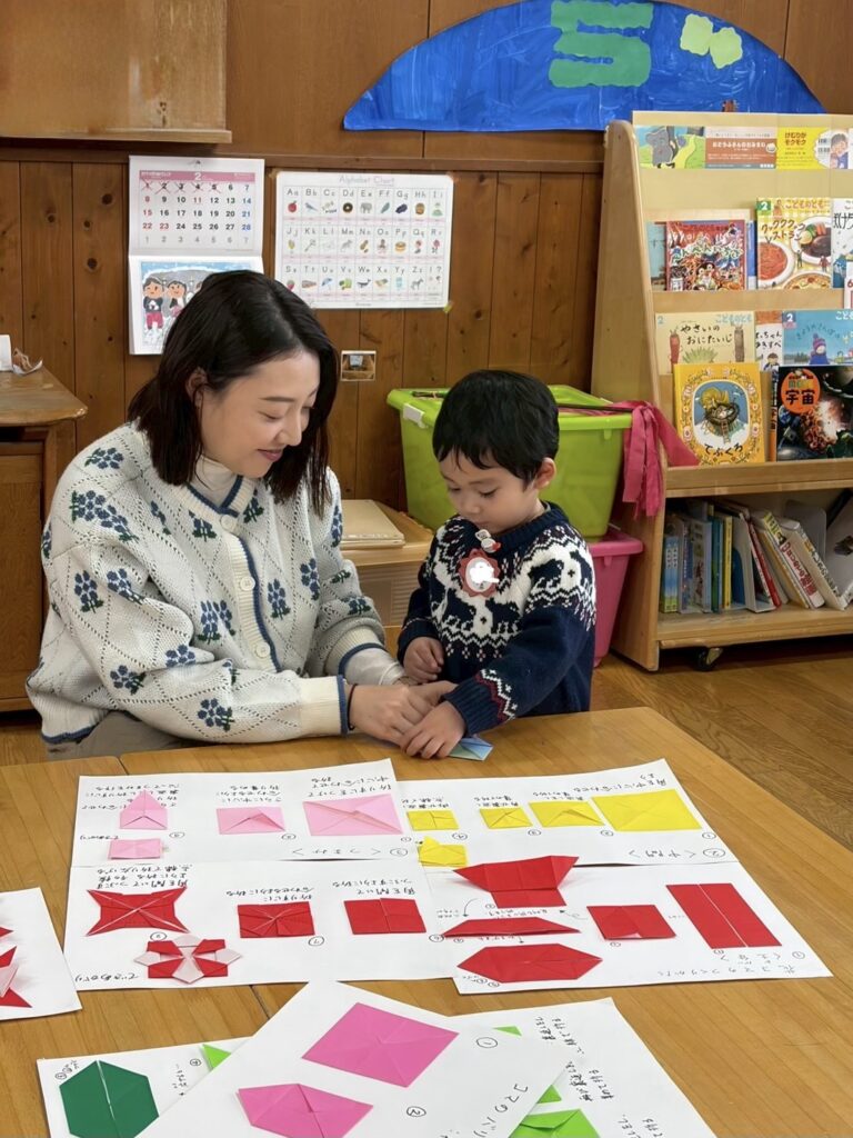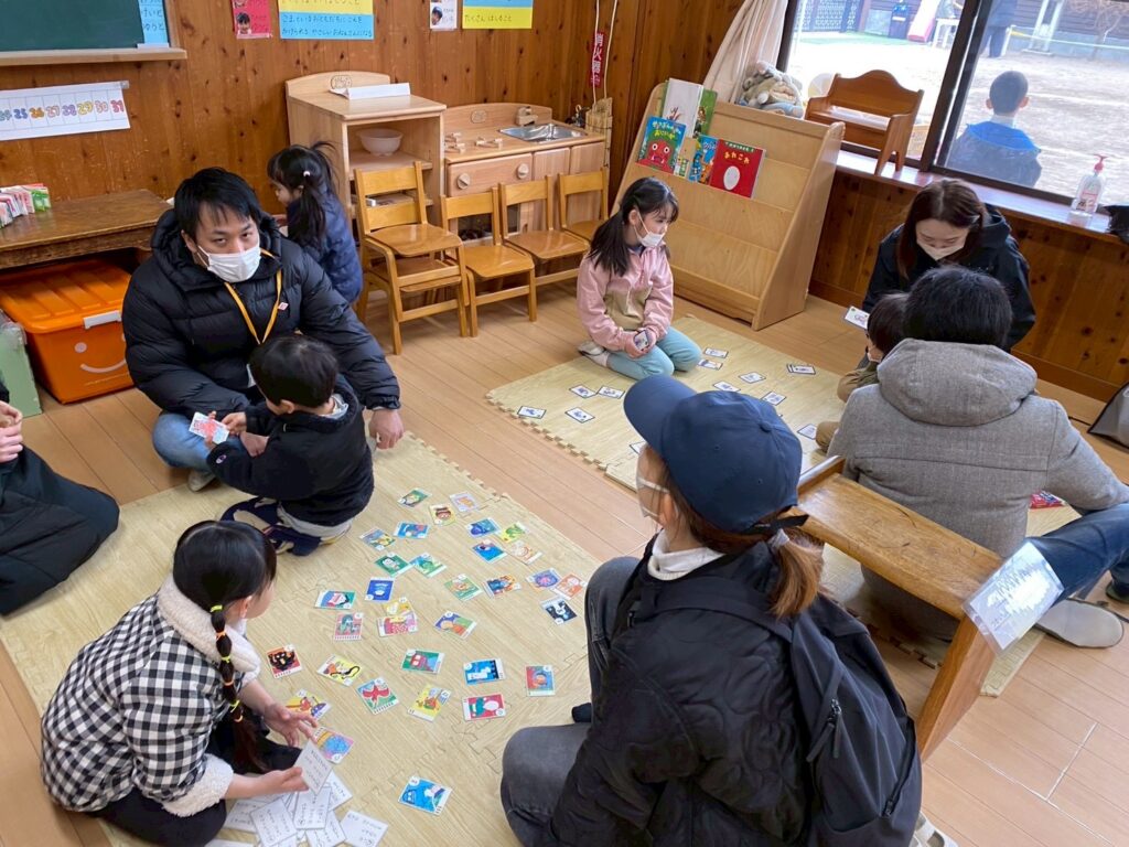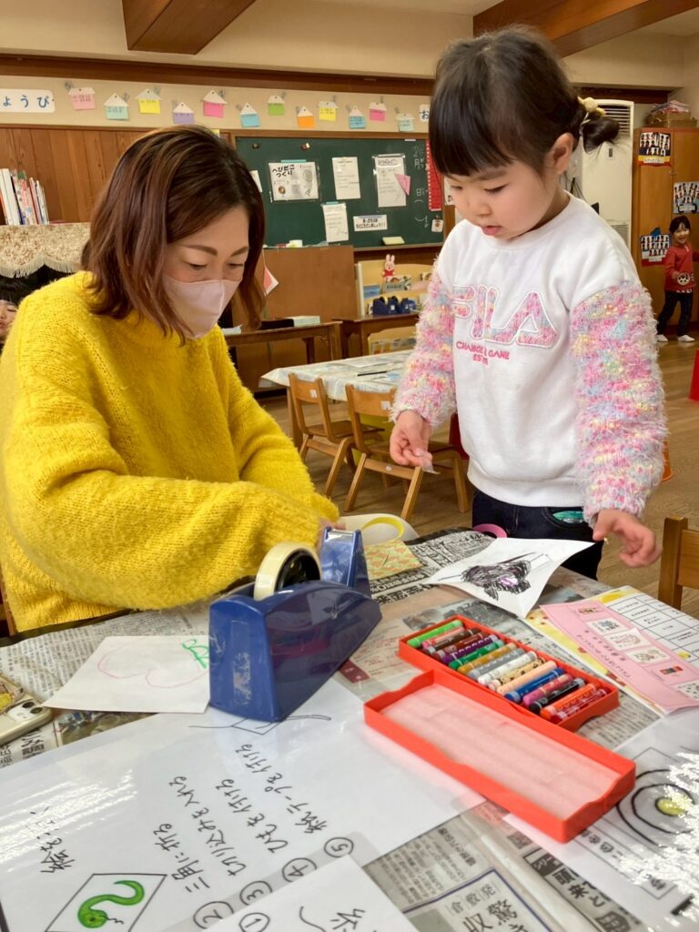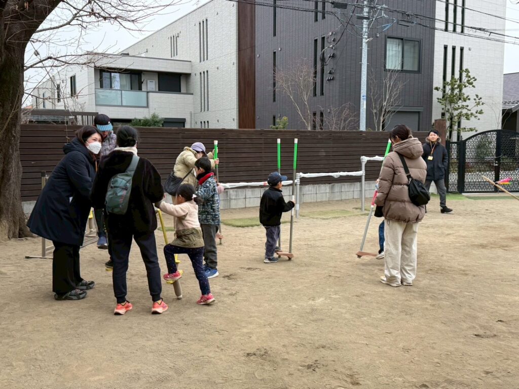 今日は伝承遊びの日。家族で伝承遊びを楽しんでいただきました。折り紙ごま作り、福笑い、たこ作り、かるた遊び、竹馬、ホッピング、たこあげ、けん玉、コマ回し、だるま落としなど色々と頑張りました。そして最後に発表をしたい子が発表しました。寒い中、お越しくださりありがとうございます。親子ならではの素敵な光景がたくさん見られました。