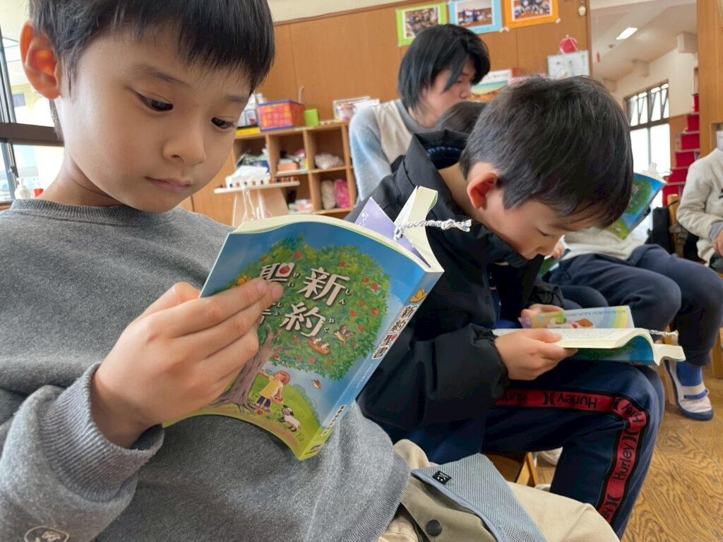今日は、合同礼拝で最後の晩餐の話を聞きました。イエス様は殺されることがわかっていて、3日後に復活することもわかっていて最後の食事を弟子たちといただく…どんな思いがしたのだろうと考えると胸が詰まる思いです。子どもたちもじっと聞いていました。「どうして、イエス様をつかまえるの?つかまって殺されるのはどうして?」とイエス様がなぜそういうことになるのだろうと純粋な疑問が沸き上がりました。年長児は聖書で暗唱聖句の箇所をひき、読みました。