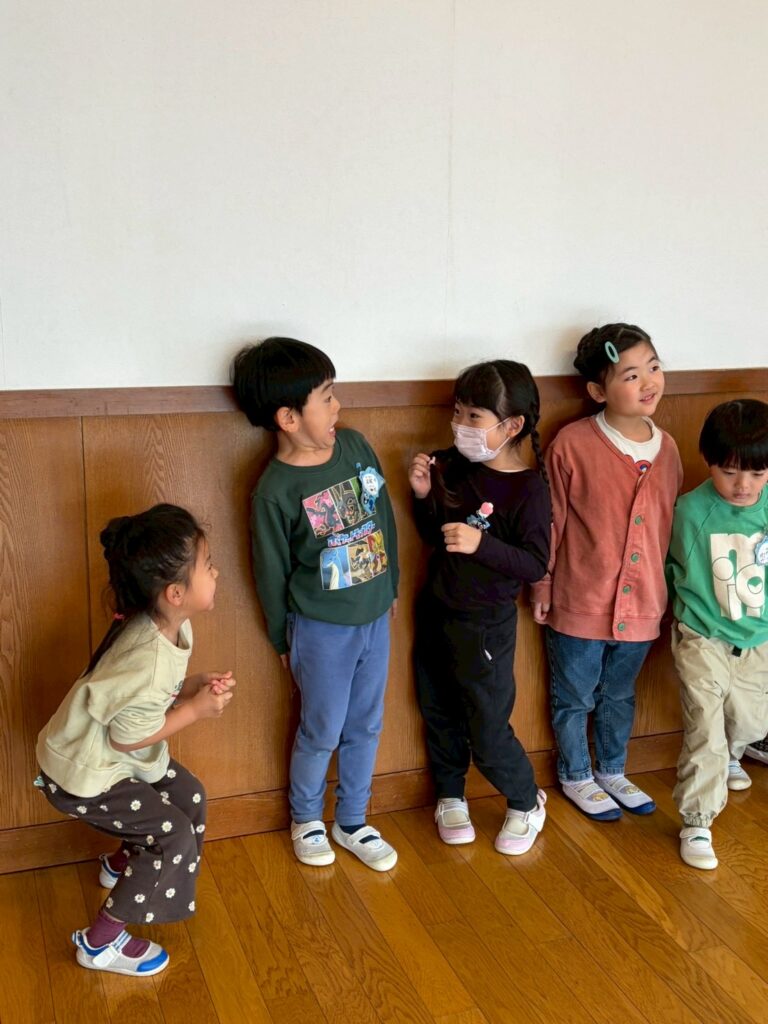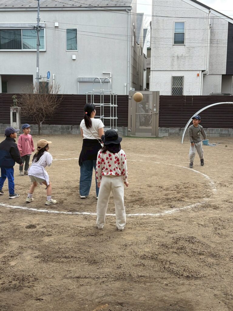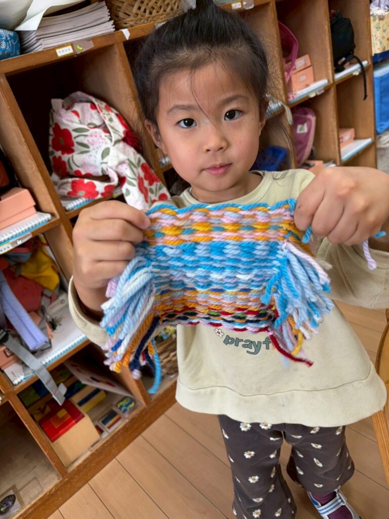 遊びの時間では実習生と鬼ごっこや、実習生が作ってきたパズルで楽しみました。手作りパズルはなかなか難しかったですが、話し合って完成させていきました。年中児のやりたい子が織物で鍋敷きを作っています。完成させて嬉しそうでした。年長児は中当てを楽しそうにやっていました。