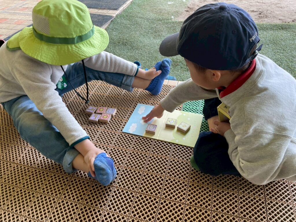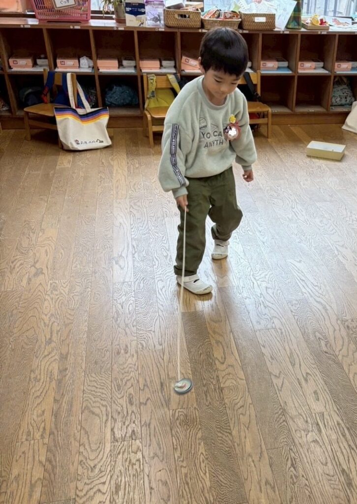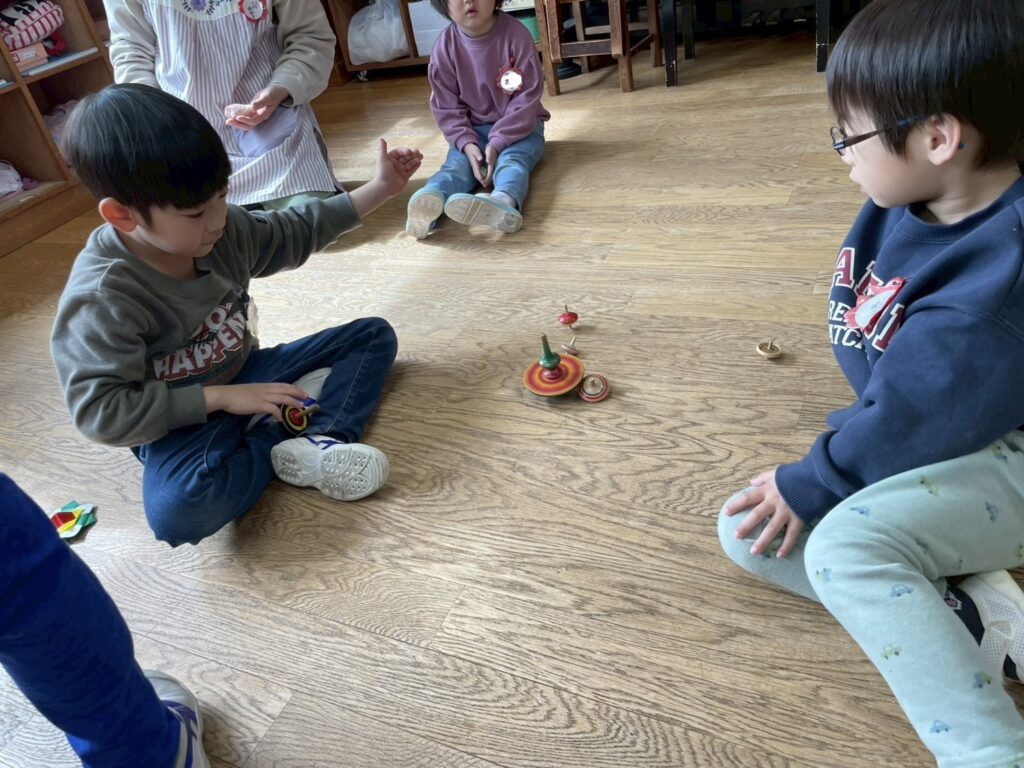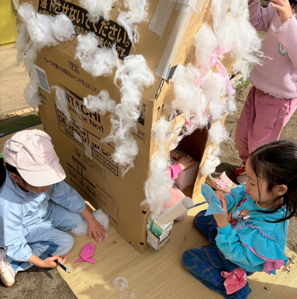 今日は、様々な場所で遊ぶ姿が見られました。花粉症の子どもが増えてきているので室内で遊ぶように伝えています。年長児がどうぶつ将棋をテラスで楽しむ姿がありました。年長児が紐を巻いてあげて、年少児が紐ゴマを回せるようになりました。とても嬉しそうでした。年中児がケーキの小屋を作りました。綿いっぱい!結構飛んで、綿をビニールに入れて動物を作り楽しみました。