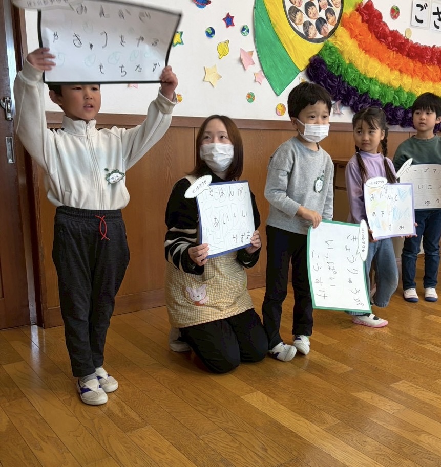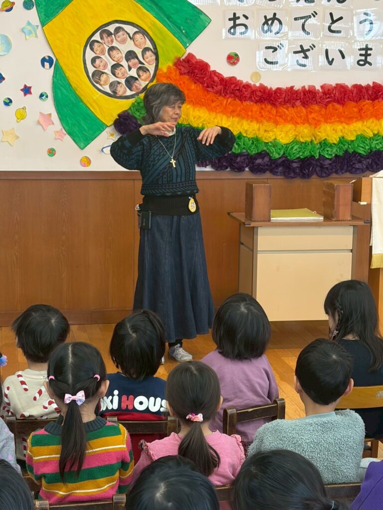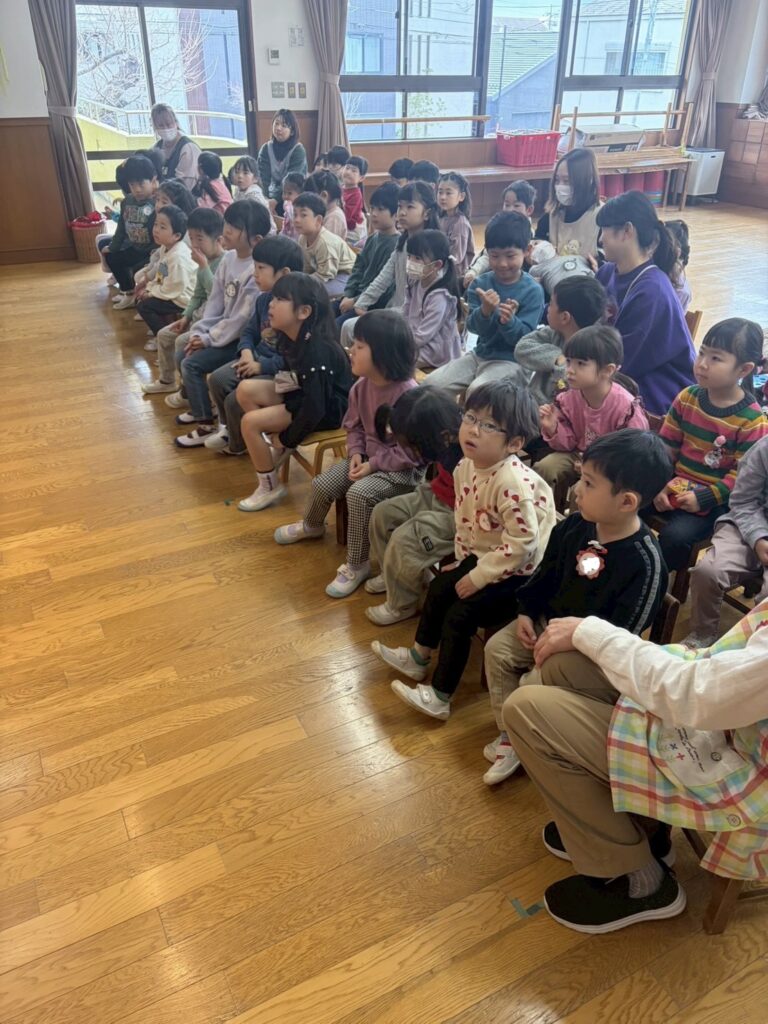 今日は、今年度最後の合同礼拝でした。イエス様は例え話が好きで、イエス様がぶどうの木で私たちはその枝であり、繋がっていればいつかおいしい実を結ぶことができるという話でした。皆はどんな実になりたいか、考えてみましょうとお話しされました。イエス様の言葉を思い出し、支えとなり、力になるといいなと思います。年長児の最後の歌の披露。とても真剣に聴いて感動する年中・年少児。憧れの年長児が明後日卒園式を迎えます。